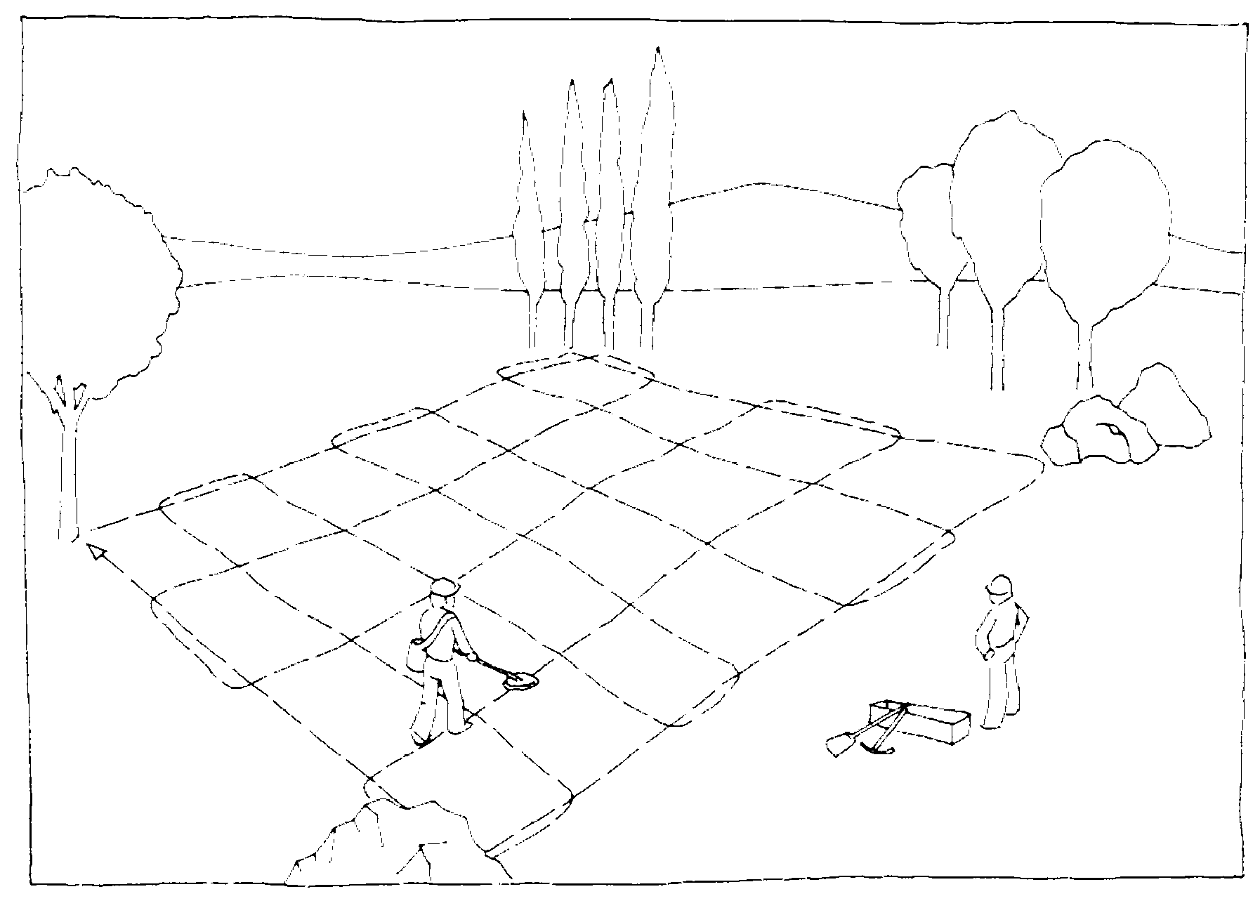(6802C28 SO)[This is using a metal detector to locate things buried underground and marking on a paper divided into grid squares where readings occurred so that you end up with a record of an area searched and where readings occurred in that area.]